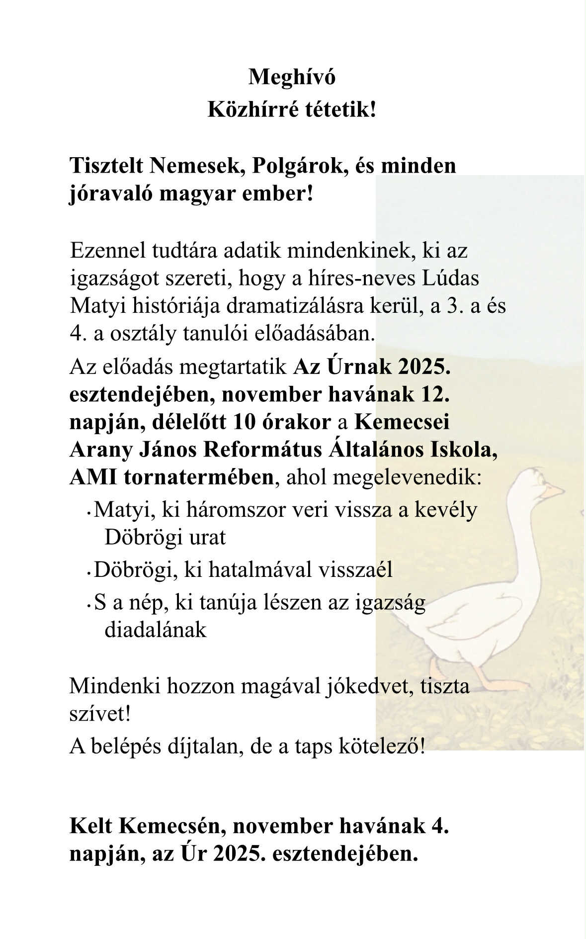 Ma a 3.a és 4.a osztályos gyerekek előadták a Lúdas Matyit az ovisoknak.Felkészítő pedagógusok: Bertalanné Anikó Dócs, Mónika Szabó